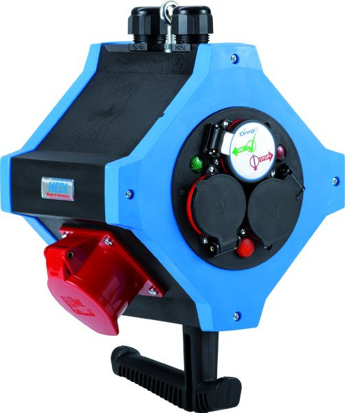 Elektrische-Ausführung, Ausgänge: 6 x Schuko-Steckdosen 250 V, 2 x CEE-Steckdosen 5x16 A / 400 V, mit 2 m verzinkter Knotenkette mit Karabiner zur Aufhängung, Schutzart: IP44 Energie-Hängeverteiler HEDI e.STATION Elektrische-Ausführung, Ausgänge: 6 x Schuko-Steckdosen 250 V, 2 x CEE-Steckdosen 5x16 A / 400 V, mit 2 m verzinkter Knotenkette mit Karabiner zur Aufhängung, Schutzart: IP44