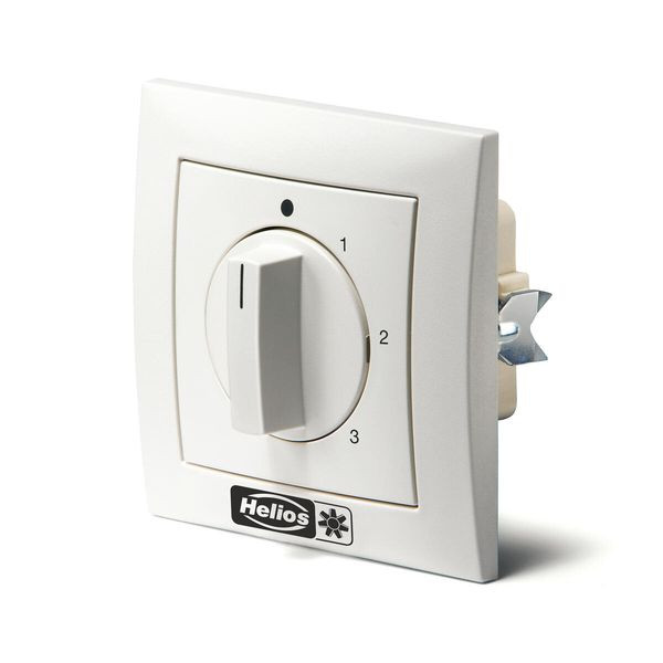 Drehschalter mit 0-Stellung zur Steuerung von Ventilatoren mit 3 Drehzahlen (z.B. ELS-VE 100/60/40 und ZEB 380). Raumlicht nicht parallel schaltbar. Front aus weißem Kunststoff. Zum Einbau in 55er UP-Dose. Schutzart IP30, 230 V, 50/60 Hz, I max., 3 A induktiv.