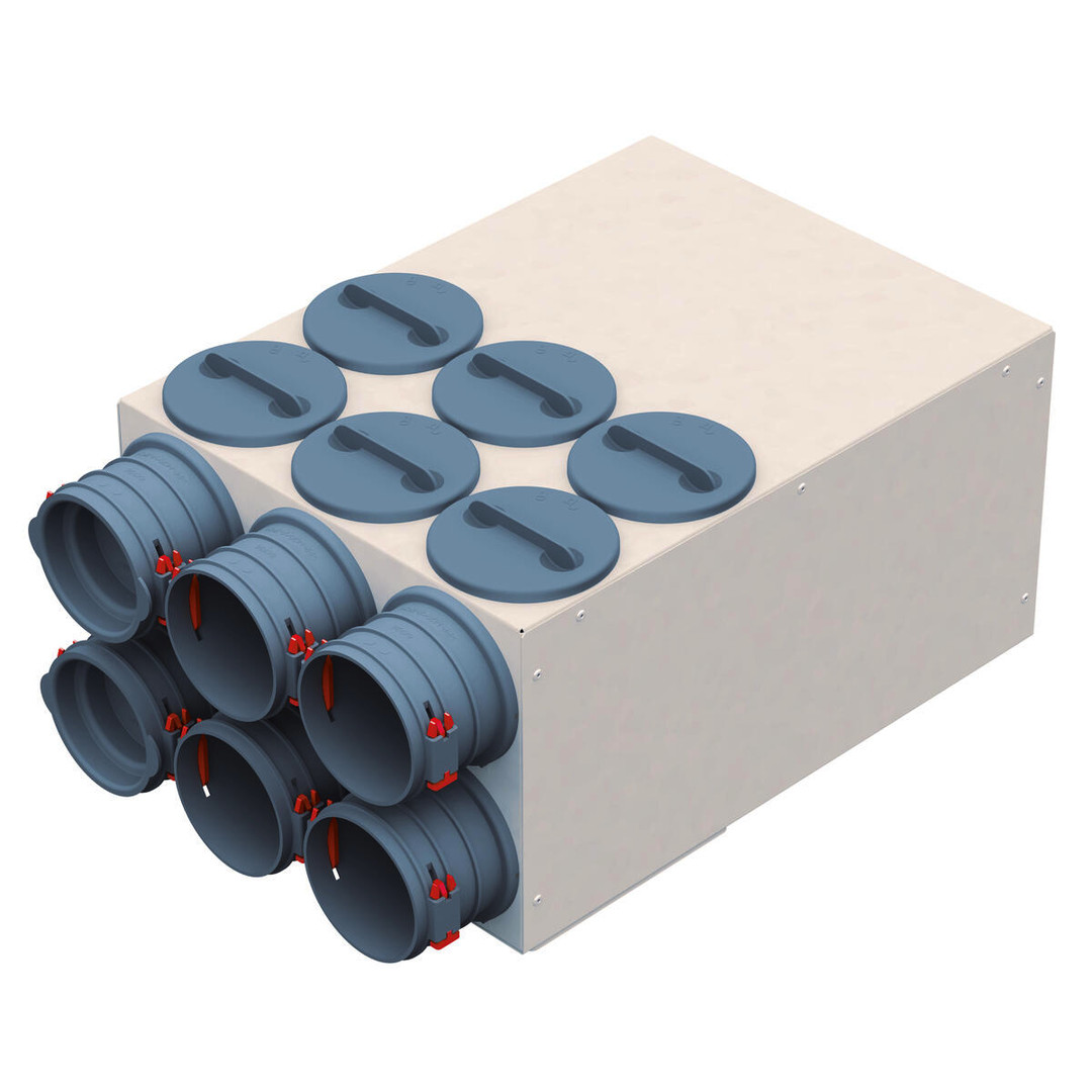 FlexPipe-plus Verteilerkasten zum Anschluss von bis zu 6 runden Lüftungsrohren FRS-R 75. Mit schallabsorbierender, glattflächiger Auskleidung der Innenseiten und großer Revisionsöffnung. 12 Anschlussmöglichkeiten für bis zu 6 runde Lüftungsrohre FRS-R 75 durch beiliegende Bajonett-Einzelstutzen. Montage der Stutzen ist waagrecht, senkrecht oder in Kombination möglich. Innenauskleidung: PU-Schaum, foliert.