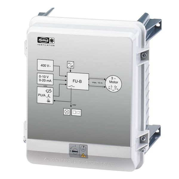 Frequenzumrichter in Basic-Ausführung ohne Sinusfilter zum Drehzahlsteuern eines einzelnen Ventilators. Die Drehzahlvorgabe erfolgt über das 0-10 V Steuersignal (z.B. Potentiometer PU/PA, Zubehör). Leitungslänge zwischen FU-B und Ventilator maximal 10 m mit abgeschirmter Leitung. Der Ventilator muss für den Betrieb mit Frequenzumrichter ausgelegt sein (EMV-geeigneter Ventilator/Motor, evtl. Sonderausführung). Der Frequenzumrichter ist fest eingestellt auf seinen Nennstrom. Für FU-B Betrieb muss bei Ventilatorbestellung die Frequenzumrichtertauglichkeit angegeben werden.