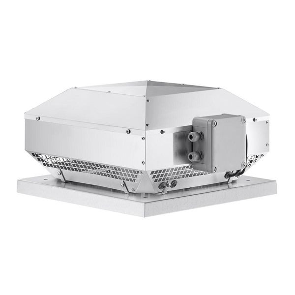 Horizontal ausblasender EC-Dachventilator mit wirkungsgradoptimiertem Aluminiumgehäuse und neu entwickeltem Hochleistungs-Radiallaufrad. Gehäuse aus seewasserbeständigem Aluminium mit integriertem Eingriffsschutz. Motortragplatte und Grundplatte mit Einströmdüse aus verzinktem Stahl. Grundplatte mit Gewindeschrauben zum Befestigen von saugseitigem Zubehör (Lochbild nach DIN 24155, Bl. 3). Schutzgitter serienmäßig an der Ausblasseite entsprechend DIN EN ISO 13857. Hochleistungs-Radial-Laufrad mit rückwärts gekrümmten Schaufeln aus Kunststoff. Dynamisch gewuchtet nach DIN ISO 1940-1. Energiesparender, drehzahlsteuerbarer EC-Außenläufermotor in geschlossener Bauart in IP 44 mit höchsten Wirkungsgraden. Kugelgelagert mit Feuchteschutzisolation. Wartungs- und funkstörungsfrei. Integrierte elektronische Temperaturüberwachung für EC-Motor und Elektronik. Serienmäßig mit außenliegendem Klemmenkasten in Schutzart IP 65 und einem internen Potentiometer für die Einstellung der Steuerspannung und dadurch einer beliebigen Ventilatordrehzahl zwischen min. und max. Drehzahl. Stufenlose Drehzahlsteuerung mit externem Potentiometer oder stufenlose Drehzahlregelung mit Universal-Regelsystem