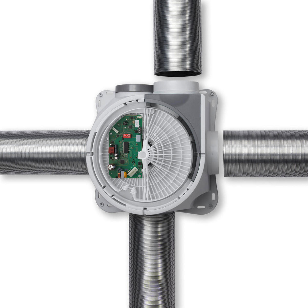 Zentralentlüftungsbox in kompakter Bauweise, mit vier Abluftansaugstutzen und einem Luftaustrittsstutzen. Robustes Gehäuse aus schlagfestem Kunststoff, hellgrau. Die drei Ansaug- und der Luftaustrittsstutzen sind für Rohre der NW 100 und 125 ausgelegt (4 Reduzierungen im Lieferumfang enthalten). Ein Ansaugstutzen ist für Rohre der NW 100, 125 und 160 ausgelegt (1 asymmetrische Reduzierung von NW 160 auf NW 125 im Lieferumfang enthalten). Stufenloser Ventilatorbetrieb erfolgt über Drehzahlregelung mit Potentiometer oder Universal-Regelsystem (Zubehör). Ventilatorbetrieb in drei Stufen mittels Betriebsschalter DSZ (Zubehör) möglich. Zur individuellen Leistungsanpassung stehen mehrere Drehzahlen durch DIP-Schalter auf der Antriebselektronik zur Auswahl. Geräuscharmes Radial-Laufrad aus Stahl in aerodynamisch optimierter Spirale. Einströmung über Düse. Energiesparender elektronisch kommutierter Gleichstrom-Außenläufer-Motor mit Kugellager für Dauerbetrieb. Hoher Wirkungsgrad auch bei Regelbetrieb. Wartungs- und funkstörfrei.