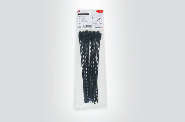 | Kurzbeschreibung | Lösbarer Kabelbinder, 260x7.0mm, Ø70.0mm, 57N, schwarz, 12ST |