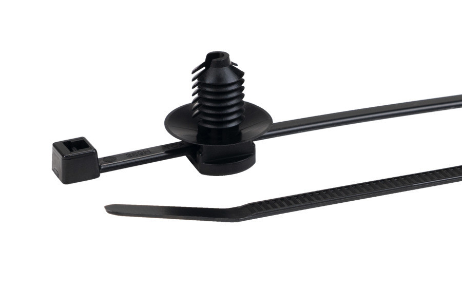 2-teiliger Kabelbinder mit Lamellenfuß, vormontiert. Der Kopf des Binders kann in die optimale Bündelposition gebracht werden. Einfache Montage, werkzeugfrei. Schützt vor eindringendem Schmutz und Staub durch Teller. Diverse Blechdicken finden Verwendung mit einem einzigen Lamellen-Fußteil. Auch für Sacklochbohrungen mit Gewinde. Diese Befestigungsbinder finden überall dort Anwendung, wo rationelles Arbeiten verbunden mit hohen Haltekräften gefordert ist. Sie sind z. B. im Schaltschrank- und Fahrzeugbau einsetzbar.