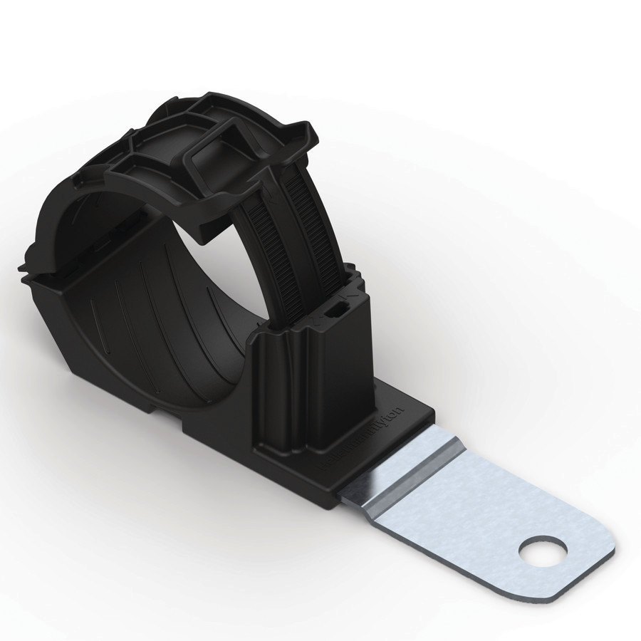 Für Bündeldurchmesser von 35,1 mm bis zu 51,0 mm geeignet. Einteiliger Ratschenverschluss ermöglicht eine unkomplizierte Installation während der Vor- und Endmontage. Vielfältige Konfigurationsmöglichkeiten decken ein großes Spektrum an Durchmessern und Anwendungen ab. Lagerbestände können reduziert werden. Die Schellenaufnahme führt und zentriert das Bündel, Quetschungen werden vermieden. Unkomplizierte Lösefunktion zur schnellen Anpassung und vereinfachten Instandhaltung. Schlagzäh modifiziertes, hitze- und UV-stabilisiertes PA66. Lange Haltbarkeit im Innen- und Außenbereich. Integrierte Stahlmontageplatte toleriert die Montage mit hohem Drehmoment. Die Befestigungsplatte ist chemikalien- und salzsprühnebelbeständig. Für empfindliches Bündelgut sind spezielle Einsätze aus weichem Material erhältlich. Separate Anzugshilfe ermöglicht definierten Anpressdruck mit Hilfe eines Handwerkzeuges (EVO-Serie). Die Produktfamilie der Ratchet P-Clamp bietet eine hohe Flexibilität beim Führen und Befestigen von Kabeln, Rohren oder Leitungen. Ihre robuste Bauform und die widerstandsfähigen Materialien machen sie ideal geeignet für Schwerlastanwendungen im Innen- und Außenbereich. Die einteilige Befestigungsschelle wird mit der Hand auf den gewünschten Durchmesser geschlossen. Mit der Lösefunktion kann das Bündel mit einem einfachen Schlitzschraubendreher problemlos und zerstörungsfrei entfernt werden. Die Schelle kann wiederverwendet werden, ohne dass die Position verändert werden muss.