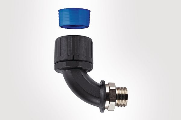 Einteilige Schnellverschraubung. Hohe Zugfestigkeit. Sehr gut beständig gegen Lösungsmittel und Öle. Halogen-, schwefel- und phosphorfrei. 90°-Verschraubung mit drehendem Messing-Außengewinde inkl. Schlauchdichtung und Dichtungsscheibe. Erfüllt IP66, IP67, IP68 und IP69k.