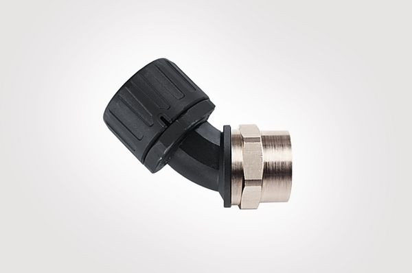 Einteilige Schnellverschraubung. Hohe Zugfestigkeit. Sehr gut beständig gegen Lösungsmittel und Öle. Halogen-, schwefel- und phosphorfrei. 45°-Verschraubung mit drehendem Messing-Innengewinde.