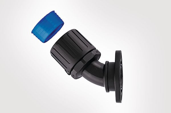 Einteilige Schnellverschraubung. Hohe Zugfestigkeit. Sehr gut beständig gegen Lösungsmittel und Öle. Halogen-, schwefel- und phosphorfrei. 45° drehende Flanschverschraubung inkl. Schlauchdichtung und Dichtungsscheibe. Erfüllt IP66, IP67, IP68 und IP69k.