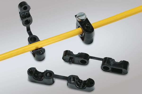Verdrehsichere Führung von Leitungen. Ober- und Unterteil durch Lasche verbunden. Einfaches Handling inklusive Verdrehschutz. Zugentlastungsschellen zum Führen von Leitungen bis 8,5 mm Bündeldurchmesser. Die Zugentlastungsschelle wird mit Hilfe einer M4 Schraube an der entsprechenden Montagefläche befestigt.