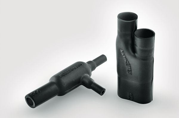 Einfaches Erstellen von 90° Abzweigungen in Kabelbäumen. Mechanischer Schutz für Verzweigstellen. Bauchig: ausreichend Platz für Verbinder. Zulassung für Wehrtechnik. Optional mit werkseitig eingebrachten thermoplastischem Innenkleber zur Abdichtung und Zugentlastung. Wärmeschrumpfende Formteile für die Verwendung an elektrischen und elektronischen Kabelbäumen.