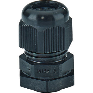 Für Innenräume und die ungeschützte Installation im Freien, mit Zugentlastung und Gegenmutter, aus Thermoplast, Schutzart: IP 65 / IP 67, schwarz ähnlich RAL 9005, Wandstärke bis 3 mm