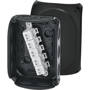 Kabelabzweigkasten aus hochwertigem Thermoplast. Für Aufputz-Anwendungen in Gebäuden oder die geschützte Installation im Freien. Mit Außenlaschen zur Befestigung und Deckelbefestigung über Schnellverschlüsse. Mit innovativer Klemmentechnik bis 10 mm², 5-polig. Kabeleinführung über elastische Dichtmembranen in Gehäusewänden und Boden. Nachträglicher Einsatz von Kabelstutzen durch Entfernen der Dichtmembrane möglich. Mit Deckelhalteband.