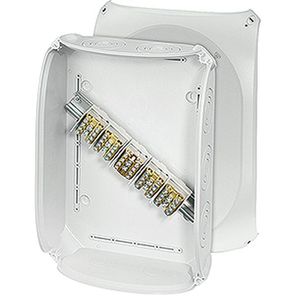 Kabelabzweigkasten aus hochwertigem Thermoplast mit Hauptleitungsabzweigklemmen für Kupferleiter. Für Aufputz-Anwendungen in Gebäuden oder die geschützte Installation im Freien. Mit Außenlaschen zur Befestigung und Deckelbefestigung über Schnellverschlüsse. Mit Hauptleitungsabzweigklemmen bis 35 mm², 5-polig. Kabeleinführung über metrische Vorprägungen in Gehäusewänden und Boden. Beigefügte Einsteckstutzen in Schutzart IP 55.