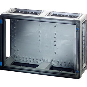 Typgeprüftes System (TSK nach IEC 60 439-1) Gehäuse mit Tür für den Bau von Installationsverteilern bis 250 A für die Bedienung durch Laien nach IEC 61439-3. Offene Gehäusewände für die Kombination oder als Einzelgehäuse mit Verschlussplatten. Aus hochwertigem Polycarbonat, schutzisoliert. Schnelle Gehäuseverbindung durch Steckverbinder und integrierte Dichtungen. Große Wanddurchführungen für die elektrische Verbindung der Gehäuse untereinander. Kabeleinführung über Flansche. Wandbefestigung direkt am Gehäuse, über Außenlaschen oder mit Montageschienen. Leergehäuse mit transparenter Tür und Türverschluss mit Werkzeugbetätigung. Für den Einbau von Geräten auf Montageplatte oder DIN-Tragschiene, Einbaumaße B 486 x H 306 x T 140 mm. Max. Einbautiefe bei eingebauter Montageplatte 136 mm, bei eingebauter Tragschiene 125 mm. Die Plombiervorrichtung für die Türplombierung muss separat bestellt werden.