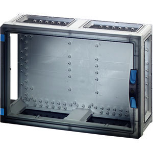 Hinweis: Einbaugeräte müssen für Laienbedienung geeignet sein oder abgedeckt werden. Gehäuse mit Tür für den Bau von Installationsverteilern bis 250 A für die Bedienung durch Laien nach IEC 61439-3. Offene Gehäusewände für die Kombination oder als Einzelgehäuse mit Verschlussplatten. Aus hochwertigem Polycarbonat, schutzisoliert. Schnelle Gehäuseverbindung durch Steckverbinder und integrierte Dichtungen. Große Wanddurchführungen für die elektrische Verbindung der Gehäuse untereinander. Kabeleinführung über Flansche. Wandbefestigung direkt am Gehäuse, über Außenlaschen oder mit Montageschienen. Leergehäuse mit transparenter Tür und plombierbarem Türverschluss mit Handbetätigung. Für den Einbau von Geräten auf Montageplatte oder DIN-Tragschiene, Einbaumaße B 486 x H 306 x T 140 mm. Max. Einbautiefe bei eingebauter Montageplatte 136 mm, bei eingebauter Tragschiene 125 mm.