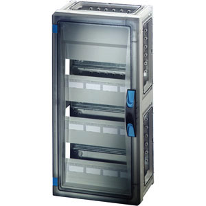 Gehäuse mit Tür für den Bau von Installationsverteilern bis 250 A für die Bedienung durch Laien nach IEC 61439-3. Offene Gehäusewände für die Kombination oder als Einzelgehäuse mit Verschlussplatten. Aus hochwertigem Polycarbonat, schutzisoliert. Schnelle Gehäuseverbindung durch Steckverbinder und integrierte Dichtungen. Große Wanddurchführungen für die elektrische Verbindung der Gehäuse untereinander. Kabeleinführung über Flansche. Wandbefestigung direkt am Gehäuse, über Außenlaschen oder mit Montageschienen. Automatengehäuse mit 36 Teilungseinheiten zum Einbau von Reiheneinbaugeräten nach DIN 43880. Ohne PE- und N-Klemmen. Mit Abdeckstreifen zum Verschließen von nicht benutzten Geräteausschnitten und Beschriftungsstreifen für die Stromkreiskennzeichnung. Transparente Tür und plombierbarer Türverschluss mit Handbetätigung.