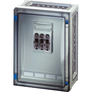 3polig 125 A, 1 x NH 00C Gehäuse mit Tür für den Bau von Installationsverteilern bis 250 A für die Bedienung durch Laien nach IEC 61439-3. Offene Gehäusewände für die Kombination oder als Einzelgehäuse mit Verschlussplatten. Aus hochwertigem Polycarbonat, schutzisoliert. Schnelle Gehäuseverbindung durch Steckverbinder und integrierte Dichtungen. Große Wanddurchführungen für die elektrische Verbindung der Gehäuse untereinander. Kabeleinführung über Flansche. Wandbefestigung direkt am Gehäuse, über Außenlaschen oder mit Montageschienen. Gehäuse mit Sicherungslasttrennschalter NH 00C, 3-polig, nach IEC 60947-3 auf Montageplatte. Mit Zuleitungsklemmen, PE- und N-Klemmen. Mit Brücke zur Aufteilung der Zuleitung. Anschlussraum veränderbar. Mit transparenter Tür und Türverschluss mit Werkzeugbetätigung.