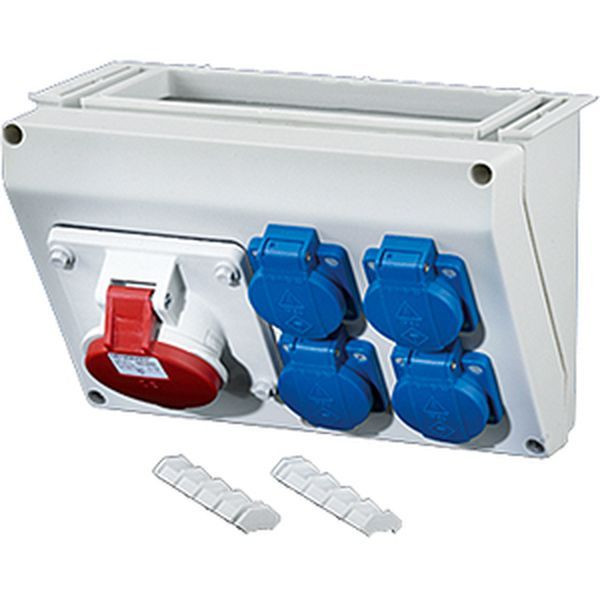 4 x 16 A, 2-polig+E, 230 v Connection Box mit 1 x CEE-Steckdose 16 A, 5-polig und 4 x Schuko-Steckdose 16 A, 2-polig + PE. Zum Anbau an Gehäusewände 270 mm. Steckdosen können um 90° gedreht werden.