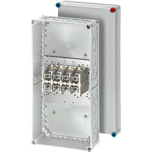 Kabelabzweigkasten aus hochwertigem Thermoplast mit Klemmen für Aluminium- und Kupferleiter. Für Aufputz-Anwendungen in Gebäuden oder die geschützte Installation im Freien. Kabelstutzen und Anbauflansche im Zubehör. Mit Klemmen bis 240 mm², 4-polig. Leiter können von vorn in die Klemmstelle eingelegt werden.