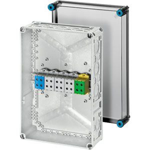 Kabelabzweigkasten aus hochwertigem Thermoplast mit Klemmen für Aluminium- und Kupferleiter. Für Aufputz-Anwendungen in Gebäuden oder die geschützte Installation im Freien. Kabelstutzen und Anbauflansche im Zubehör. Mit Klemmen bis 95 mm², 5-polig. Leiter werden in die Schraubklemme eingesteckt.