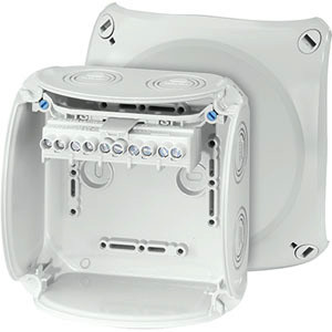 Kabelabzweigkasten aus hochwertigem Thermoplast für die ungeschützte Installation im Freien oder Aufputz-Anwendungen in Gebäuden. Beständig gegen Witterungseinflüsse wie UV-Belastung durch Sonneneinstrahlung, geschützt gegen Regenwasser, temperaturbeständig und schlagfest. Deckelbefestigung über Schnellverschlüsse. Mit Außenlaschen zur Befestigung. Seewasserbeständig, für Offshore-Anwendungen. Mit Zulassung für die Installation auf Schiffen. Klemme mit 2 Klemmstellen je Pol bis 6 mm², 5-polig. Kabeleinführung über metrische Vorprägungen in Gehäusewänden und Boden. Anbau-Kabelstutzen im Zubehör. Mit Deckelhalteband.