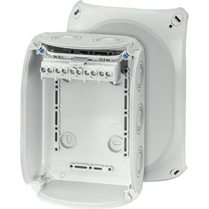 Kabelabzweigkasten aus hochwertigem Thermoplast für die ungeschützte Installation im Freien oder Aufputz-Anwendungen in Gebäuden. Beständig gegen Witterungseinflüsse wie UV-Belastung durch Sonneneinstrahlung, geschützt gegen Regenwasser, temperaturbeständig und schlagfest. Deckelbefestigung über Schnellverschlüsse. Mit Außenlaschen zur Befestigung. Seewasserbeständig, für Offshore-Anwendungen. Mit Zulassung für die Installation auf Schiffen. Klemme mit 2 Klemmstellen je Pol bis 6 mm², 5-polig. Kabeleinführung über metrische Vorprägungen in Gehäusewänden und Boden. Anbau-Kabelstutzen im Zubehör. Mit Deckelhalteband.