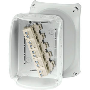 Kabelabzweigkasten aus hochwertigem Thermoplast für die ungeschützte Installation im Freien oder Aufputz-Anwendungen in Gebäuden. Beständig gegen Witterungseinflüsse wie UV-Belastung durch Sonneneinstrahlung, geschützt gegen Regenwasser, temperaturbeständig und schlagfest. Deckelbefestigung über Schnellverschlüsse. Mit Außenlaschen zur Befestigung. Seewasserbeständig, für Offshore-Anwendungen. Mit Zulassung für die Installation auf Schiffen. Klemme mit 2 Klemmstellen je Pol bis 10 mm², 5-polig. Kabeleinführung über metrische Vorprägungen in Gehäusewänden und Boden. Anbau-Kabelstutzen im Zubehör.