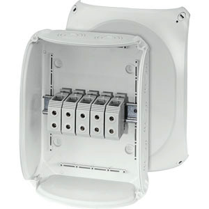 Kabelabzweigkasten aus hochwertigem Thermoplast für die ungeschützte Installation im Freien oder Aufputz-Anwendungen in Gebäuden. Beständig gegen Witterungseinflüsse wie UV-Belastung durch Sonneneinstrahlung, geschützt gegen Regenwasser, temperaturbeständig und schlagfest. Deckelbefestigung über Schnellverschlüsse. Mit Außenlaschen zur Befestigung. Seewasserbeständig, für Offshore-Anwendungen. Mit Zulassung für die Installation auf Schiffen. Klemme mit 2 Klemmstellen je Pol bis 35 mm², 5-polig. Kabeleinführung über metrische Vorprägungen in Gehäusewänden und Boden. Anbau-Kabelstutzen im Zubehör.