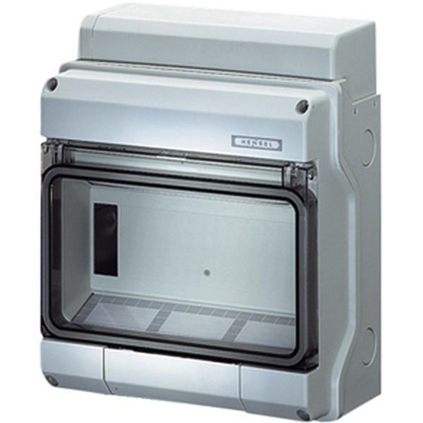 aus Thermoplast, grau nach RAL 7035, zum Einbau von Geräten mit Schnappbefestigung auf DIN-Tragschiene, Hutprofil 35 mm, Bemessungsisolationsspannungspannung AC 400 V, mit transparenter Klappe, Geräteausschnitt ausbrechbar, FIXCONNECT® Steckklemmentechnik für PE und N, mit integrierten, elastischen Dichtmembranen zur Kabeleinführung oben und unten.