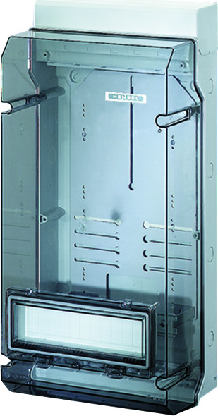Kleinverteiler Zählergehäuse aus hochwertigem Thermoplast. Für Aufputz-Anwendungen in Gebäuden oder die geschützte Installation im Freien. Einsatz im ungemessenen Bereich nach Absprache mit dem örtlichen Netzbetreiber. Mit Zählertragplatte und Zählerbefestigungsschrauben für Zähler mit Dreipunktbefestigung und Klappdeckel mit Berührungsschutz für 12 Teilungseinheiten. Kabeleinführung über integrierte elastische Dichtmembranen. Mit transparentem Deckel und Kabeleinführungsblende. Verschlüsse für Werkzeugbetätigung, plombierbar. Schutzart IP 65.