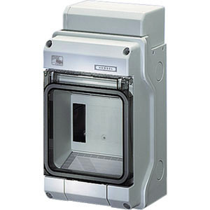 Kleinverteiler aus hochwertigem Thermoplast (Polycarbonat). Für Aufputz-Anwendungen für die ungeschützte Installation im Freien oder in Gebäuden. Automatengehäuse, mit 4,5 Teilungseinheiten, zum Einbau von Geräten mit Schnappbefestigung auf DIN-Tragschiene. Kabeleinführung erfolgt über metrische Vorprägungen. Mit transparenter Klappe, Kabeleinführungsblende und ausbrechbarem Geräteausschnitt. Schutzart IP 65.