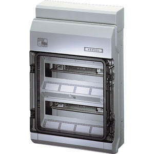 Kleinverteiler aus hochwertigem Thermoplast (Polycarbonat). Für Aufputz-Anwendungen für die ungeschützte Installation im Freien oder in Gebäuden. Automatengehäuse, mit 24 Teilungseinheiten, zum Einbau von Geräten mit Schnappbefestigung auf DIN-Tragschiene. Kabeleinführung über integrierte elastische Dichtmembranen. Mit transparenter Tür und Kabeleinführungsblende, integriertem Zubehörfach und Abdeckstreifen für den Geräteausschnitt. Schutzart IP 65.