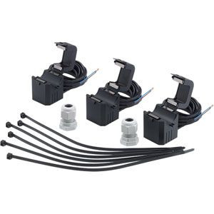 Stromwandler-Set mit 3 teilbaren Umbaustromwandlern, 400/1 A (Genauigkeitsklasse 1). Zum Einbau an isolierten Leitern oder Verdrahtungsband. Mit Messleitungen.