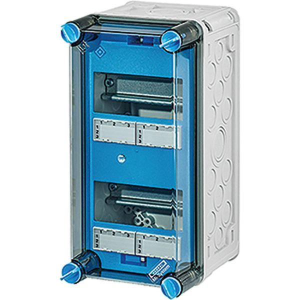 Gehäuse für den Bau von Energie-Schaltgerätekombinationen bis 630 A oder als Einzelgehäuse. Aus hochwertigem Polycarbonat schutzisoliert. Wanddurchführungen mit großen Öffnungen für die elektrische Verbindung der Gehäuse untereinander. Kabeleinführung an allen Gehäusewänden über metrische Vorprägungen oder Anbauflansche. Gehäuse zur Wandbefestigung auch über Außenlaschen oder mit Montageschienen. Automatengehäuse mit 12 Teilungseinheiten zum Einbau von Reiheneinbaugeräten nach DIN 43880. Ohne PE- und N-Klemmen. Mit Abdeckstreifen zum Verschließen von nicht benutzten Geräteausschnitten und Beschriftungsstreifen für die Stromkreiskennzeichnung. Transparenter Deckel, Deckelverschlüsse für Handbetätigung.