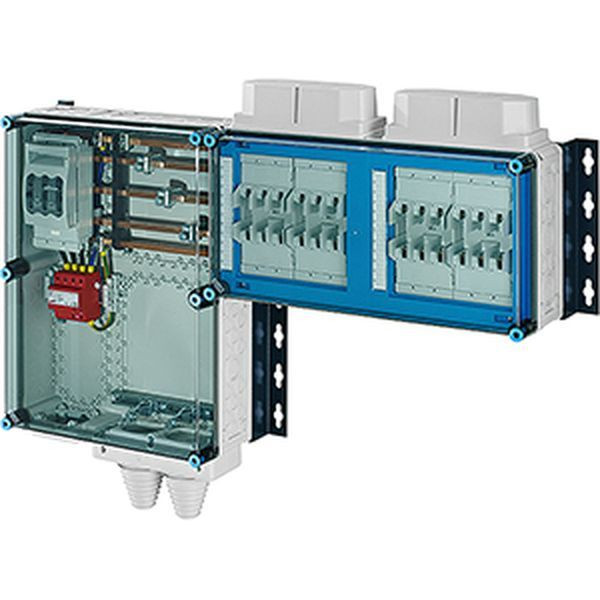 Gehäuse für den Bau von Energie-Schaltgerätekombinationen bis 630 A oder als Einzelgehäuse. Aus hochwertigem Polycarbonat schutzisoliert. Wanddurchführungen mit großen Öffnungen für die elektrische Verbindung der Gehäuse untereinander. Kabeleinführung an allen Gehäusewänden über metrische Vorprägungen oder Anbauflansche. Gehäuse zur Wandbefestigung auch über Außenlaschen oder mit Montageschienen. Anschlussfertiger Verteiler mit 4 Sicherungsunterteilen NH 00, 3-polig, auf 5-poligem Sammelschienensystem 250 A.