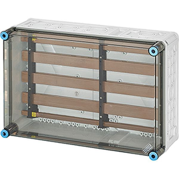 Gehäuse für den Bau von Energie-Schaltgerätekombinationen bis 630 A oder als Einzelgehäuse. Aus hochwertigem Polycarbonat schutzisoliert. Wanddurchführungen mit großen Öffnungen für die elektrische Verbindung der Gehäuse untereinander. Kabeleinführung an allen Gehäusewänden über metrische Vorprägungen oder Anbauflansche. Gehäuse zur Wandbefestigung auch über Außenlaschen oder mit Montageschienen. Gehäuse mit Sammelschienen, ohne Gerät, ohne Klemmen. Deckelverschlüsse für Werkzeugbetätigung.