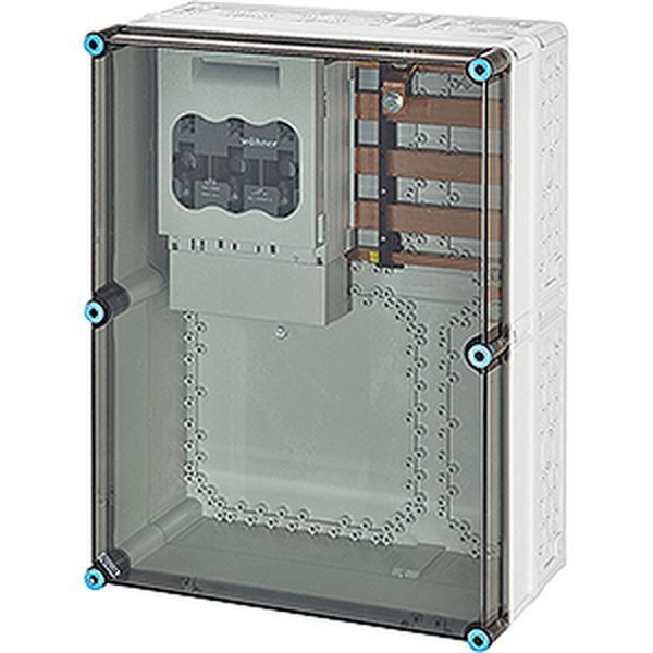 Gehäuse für den Bau von Energie-Schaltgerätekombinationen bis 630 A oder als Einzelgehäuse. Aus hochwertigem Polycarbonat schutzisoliert. Wanddurchführungen mit großen Öffnungen für die elektrische Verbindung der Gehäuse untereinander. Kabeleinführung an allen Gehäusewänden über metrische Vorprägungen oder Anbauflansche. Gehäuse zur Wandbefestigung auch über Außenlaschen oder mit Montageschienen. Gehäuse mit Sicherungslasttrennschalter NH 1, 3-polig, nach IEC 60947-3 auf Sammelschienen. Ohne Zuleitungsklemmen. Mit PE- und N-Klemmen. Anschlussrichtung veränderbar. Deckelverschlüsse für Werkzeugbetätigung.