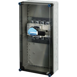 Gehäuse für den Bau von Energie-Schaltgerätekombinationen bis 630 A oder als Einzelgehäuse. Aus hochwertigem Polycarbonat schutzisoliert. Wanddurchführungen mit großen Öffnungen für die elektrische Verbindung der Gehäuse untereinander. Kabeleinführung an allen Gehäusewänden über metrische Vorprägungen oder Anbauflansche. Gehäuse zur Wandbefestigung auch über Außenlaschen oder mit Montageschienen. Gehäuse mit Lasttrennschalter 250 A, 4-polig, nach IEC 60947-3. Mit PE-Klemme für Kupferleiter. Griff des Lasttrennschalters abschließbar. Deckelverschlüsse für Werkzeugbetätigung.