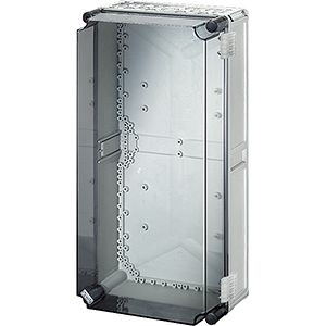 Gehäuse für den Bau von Energie-Schaltgerätekombinationen bis 630 A oder als Einzelgehäuse. Aus hochwertigem Polycarbonat schutzisoliert. Wanddurchführungen mit großen Öffnungen für die elektrische Verbindung der Gehäuse untereinander. Kabeleinführung an allen Gehäusewänden über metrische Vorprägungen oder Anbauflansche. Gehäuse zur Wandbefestigung auch über Außenlaschen oder mit Montageschienen. Leergehäuse mit scharniertem transparenten Deckel. Einbaumaße B 275 x H 575 x T 195 mm für den Einbau von Geräten auf Montageplatte oder DIN-Tragschiene. Max. Einbautiefe bei eingebauter Montageplatte 191 mm, bei eingebauter Tragschiene 180 mm. Deckelverschlüsse mit Werkzeugbetätigung.