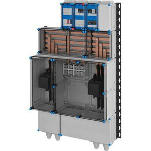 Freischaltstelle für den Anschluss von Erzeugungsanlagen an das Niederspannungsnetz sind anschlussfertige Verteilungen bis 315 kW/350 kVA entsprechend VDE-AR-N 4110 mit Kuppelschalter und NA-Schutz. Die Gehäuse aus hochwertigem Thermoplast sind schutzisoliert. Schutzart IP 54. Sie sind für die geschützte Installation im Freien geeignet und UV-beständig. Freischaltstelle für Erzeugungsanlagen wie BHKW, Photovoltaik- und Windkraftanlagen. Bemessungsleistung 200 kW/220 kVA, für 4/5-Leiter-TN-Netz. Übergeordneter Kuppelschalter mit 1 Leistungsschalter mit Motorantrieb, 3-polig, und zwischengelagertem Kuppelschalter mit 1 Leistungstrenner mit Motorantrieb, 3-polig. Deckelverschlüsse für Werkzeugbetätigung, plombierbar. Wandbefestigung mit Montageschienen.