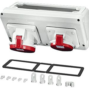 zum Einbau von Geräten, die von außen bedient werden müssen wie z.B. Steckvorrichtungen, Taster und Schalter scharnierte Einbauflächen Connection Box mit 1 x CEE-Steckdose 32 A, 5-polig und 1 x CEE-Steckdose 63 A, 5-polig. Zum Anbau an Gehäusewände 300 mm.