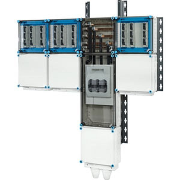 Wechselrichter-Sammler nach IEC 61439 für PV-Anlagen werden als Komplett-Set geliefert. Die Gehäuse aus hochwertigem Thermoplast sind schutzisoliert, Schutzart IP 54/IP 65. Wechselrichter-Sammler können um die Funktion Blitz- und Überspannungsschutz oder Fehlerstromschutz (RCD) erweitert werden. Sie sind für die geschützte Installation im Freien geeignet und UV-beständig. PV-Wechselrichter-Sammler bis 220 kVA mit Lasttrennschalter für Sicherung 63 A, D 02. Max. 27 x 1~ Wechselrichter oder 9 x 3~ Wechselrichter. Wandbefestigung mit Montageschienen.