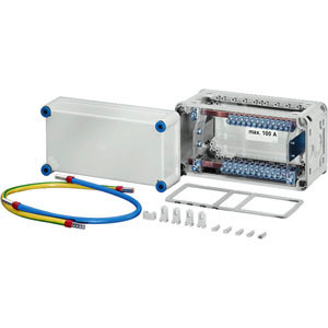 geeignet für die ungeschütze Installation im Freien, UV-beständig Schutzart: IP 65 Funktionsgehäuse als Klemmengehäuse mit Wanddichtung. Mit je 12 PE- und N-Klemmen 16 mm² und 1 PE und N-Klemme 35 mm². Deckelverschlüsse für Werkzeugbetätigung.