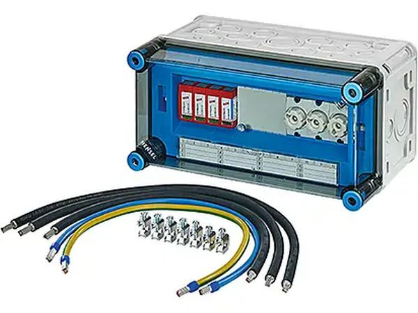 Eine isolierstoffgekapselte Niederspannungs-Schaltgerätekombination für den Wandaufbau gemäß IEC 61439-2. Das Gehäuse aus schlagfestem Polycarbonat (RAL 7035) ist für den Außeneinsatz geeignet, halogen- und silikonfrei. Der transparente Deckel hat Schnellverschlüsse und erfüllt die Glühdrahtprüfung bei 960 °C nach IEC 60695-2-11. Schutzart IP 65, Schutzklasse II, mit Überspannungsschutz (Typ 2). Maße: 150 x 300 x 170 mm.
