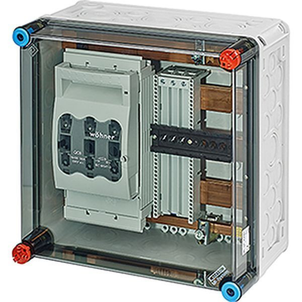 Vorbereitetes Funktionsgehäuse mit Sicherungslasttrennschalter NH 00 als Vorsicherung für 1 x Überspannungsableiter, max. 6TE. Deckelverschlüsse für Werkzeugbetätigung.