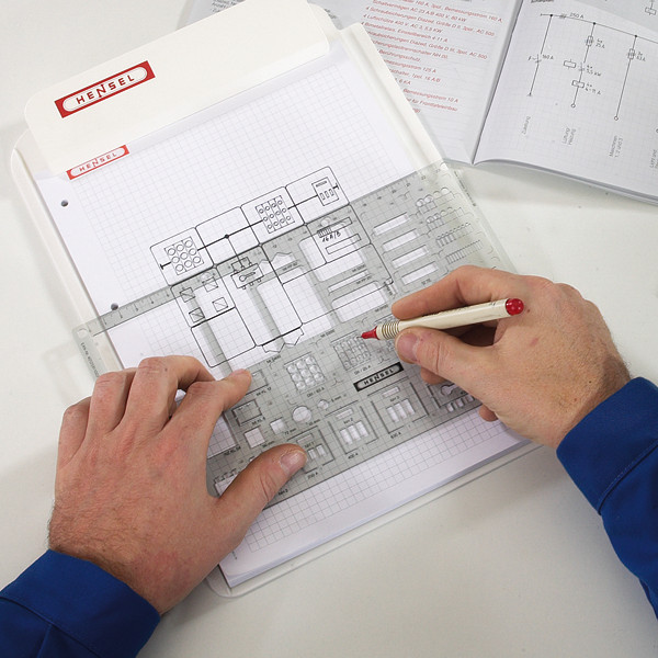 Zeichenschablone Mi-Verteiler für Elektro-Fachleute, zum Planen und Projektieren von Mi-Anlagen, aus transparentem Kunstoff, Abmessungen 250 x 155 mm.
