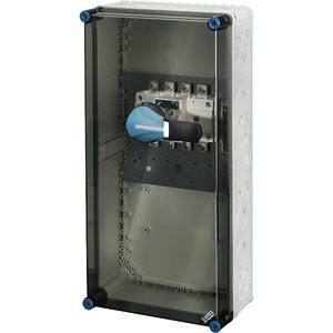Gehäuse für den Bau von Energie-Schaltgerätekombinationen bis 630 A oder als Einzelgehäuse. Aus hochwertigem Polycarbonat schutzisoliert. Wanddurchführungen mit großen Öffnungen für die elektrische Verbindung der Gehäuse untereinander. Kabeleinführung an allen Gehäusewänden über metrische Vorprägungen oder Anbauflansche. Gehäuse zur Wandbefestigung auch über Außenlaschen oder mit Montageschienen. Gehäuse mit Lasttrennschalter 160 A, 4-polig, nach IEC 60947-3. Mit PE-Klemme für Kupferleiter. Griff des Lasttrennschalters abschließbar. Deckelverschlüsse für Werkzeugbetätigung.