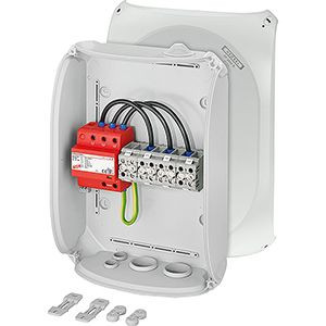 Funktionsgehäuse als Überspannungsschutzgehäuse mit 1 x Überspannungsableiter Typ 1+2. Deckelverschlüsse für Werkzeugbetätigung.
