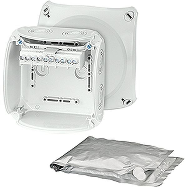 Kabelabzweigkasten aus hochwertigem Thermoplast zum Vergießen für eine wasserdichte Verbindung. Für die ungeschützte Installation im Freien bei Gefahr von Kondenswasserbildung und/oder Eintritt von Flüssigkeiten, zur Montage im Erdreich ohne Verkehrslasten. Verwendbar für Heizkabel / Heizband bis max. 70 °C Oberflächentemperatur. Für Nachinstallationen oder Prüfungen kann der Deckel abgenommen und die Vergussmasse entfernt werden. Deckelbefestigung über Schnellverschlüsse. Mit Außenlaschen zur Befestigung. Mit Klemmen bis 6 mm², 5-polig. Kabeleinführung über metrische Vorprägungen in Gehäusewänden. Anbau-Kabelstutzen im Zubehör. Mit Vergussmasse und Verschlussstopfen.