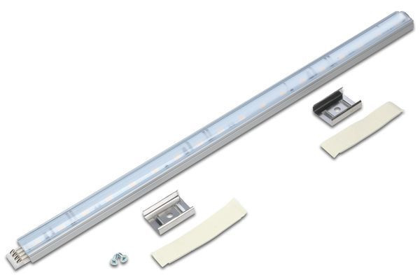 Steckbarer LED-Stab ohne Dunkelzonen im Aluminiumprofil, Lichtfarbe warm weiß ca. 3000K, einfache Montage durch beiliegende Clipbefestigung, Anschlussleitung einfach anstecken und bis zu 3m die Stäbe zusammenstecken bzw. dann jeweils einen Stick SE (mit seitlicher Einspeisung) für unendliche Lichtbänder verwenden, optionales Zubehör: dimmbarer Trafo mit Funkfernbedienung oder 1-10V Dimmer, Tast-Schalter, Abdeck- und Einfräsprofil zum kompletten Einbau in Holz